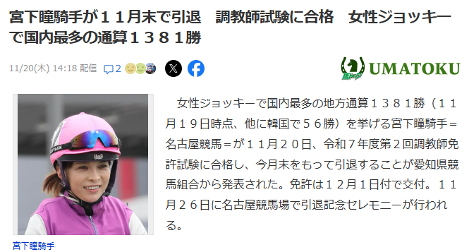 「日本人女性歴代最多勝騎手」宮下瞳騎手、調教師へ!