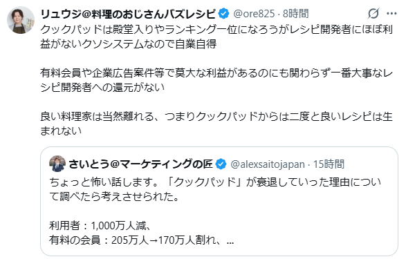 そうすると、クックパッドに熱心に料理を公開していた人たちが離脱する流れが加速。